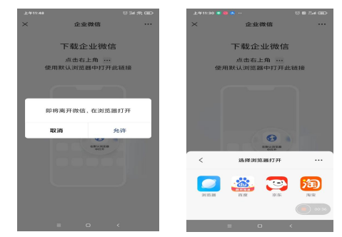 界面中会弹出提示框,选择“允许”,系统会使用默认浏览器自动下载和安装企业微信APP。