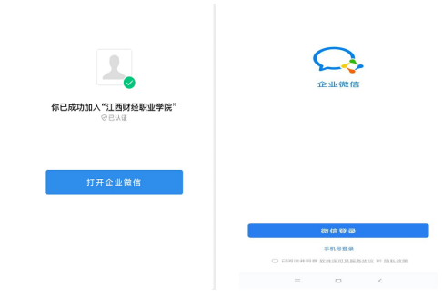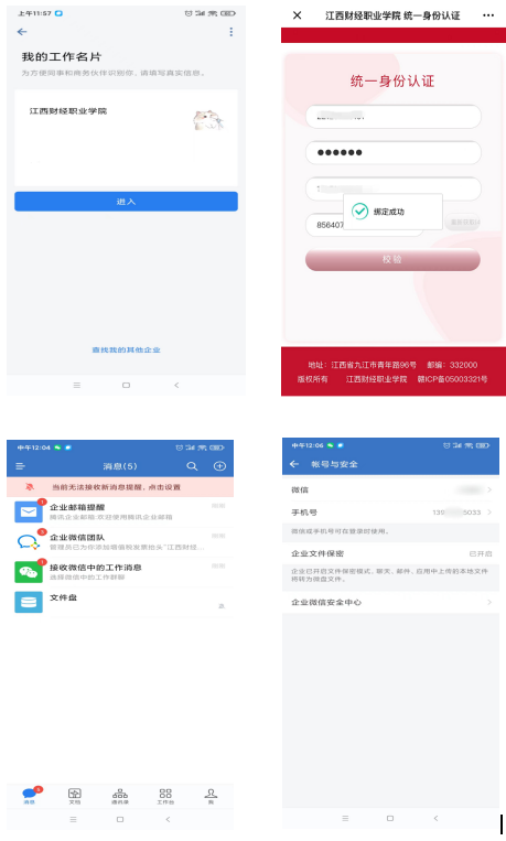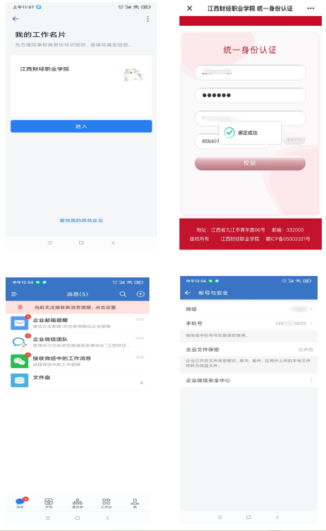 弹出的界面中点击“进入”后,进入统一身份认证界面,输入学号(职工号)和密码(默认是身份证号后6位),并获取验证码进行校验,校验成功会提示绑定成功并进入企业微信,如下图所示。