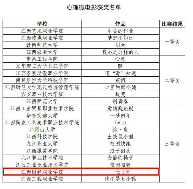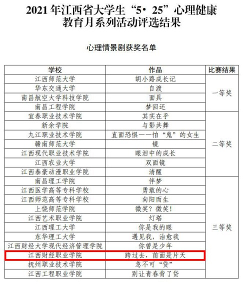 2021年9月1日,省教育厅《关于公布 2021 年江西省大学生 “5• 25”心理健康教育月系列活动评选结果的通知》正式公布了获奖结果。beat365官网选送的两项作品喜获三等奖。一项为心理情景剧《跨过去,前面是片天》,喜获“剧暖心·更青春”校园心理情景剧大赛三等奖(参演学生:洪思睿、方露、孙良豪、靳雨欣、王玉彤、张展豪、余秋梅、熊佳欢;指导教师:王美娟、张亦弛);一项为心理微电影《一念之间》,获评“多彩青春·与心同行”心理微电影大赛三等奖(参演师生:万凯、王美娟、张亦弛、周婷、徐昌达、门子俊楠、祝献东;指导教师:王美娟、张亦弛)。