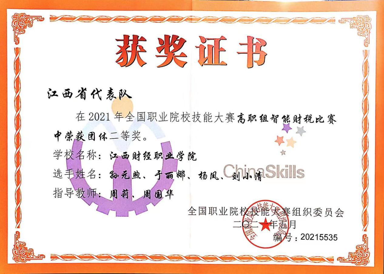 2021年7月19日至20日,全国职业院校技能大赛(高职组)“智能财税”赛项在湛江市奥林匹克体育中心成功举办。经过激烈竞争,beat365官网孙元煦、于丽娜、杨凤、刘小清4名同学(指导老师:财税金融学院周莉、数字经济学院周国华)组建成的江西省参赛代表队最终以总分第7的成绩荣获“团体二等奖”。