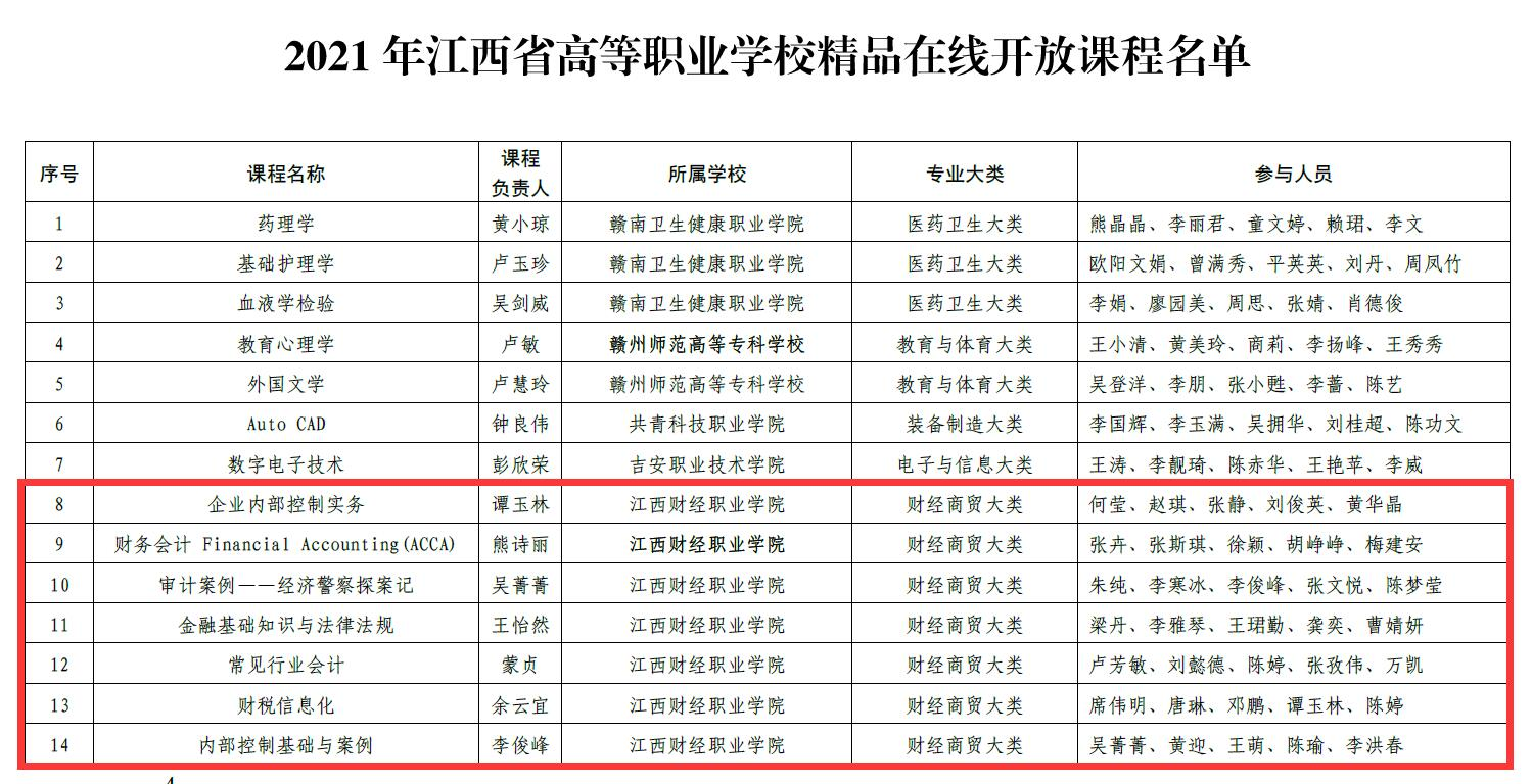 近日,省教育厅发文公布2021年江西省高等职业院校精品在线开放课程认定结果,beat365官网《企业内部控制实务》等7门课程位列其中,入选课程门数在全省并列第二,具体如下。