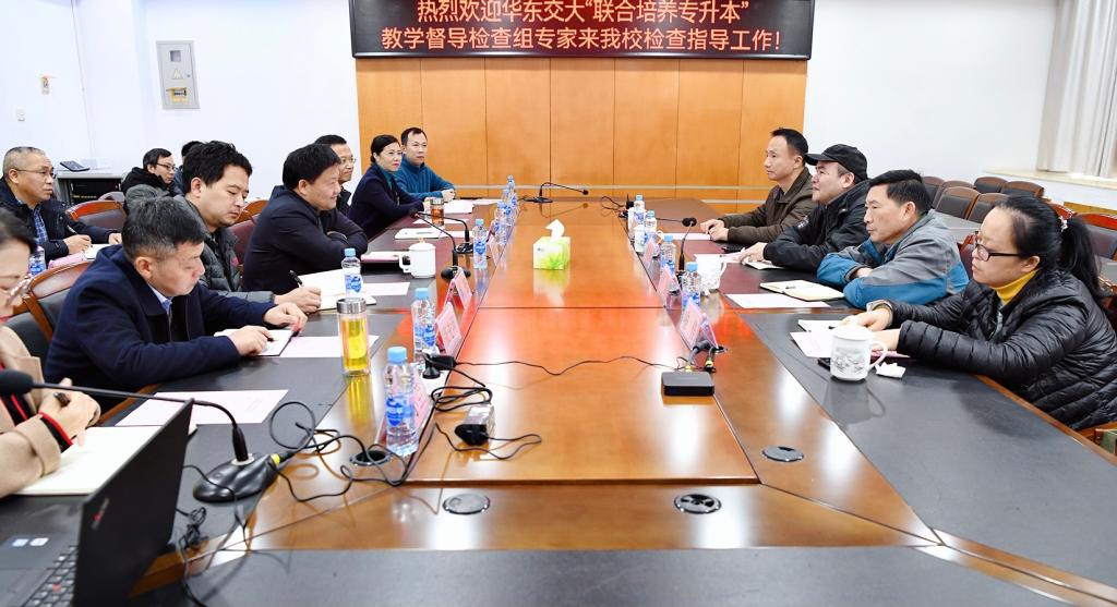 12月16日上午,华东交通大学“联合培养专升本”教学督导检查组组长蒋兆峰、秘书卢剑、组员王永祥、喻佳一行4人莅临beat365官网进行教学督导检查交流工作。校党委副书记、校长刘彪文,相关二级学院及职能部门有关负责人参加交流座谈会。