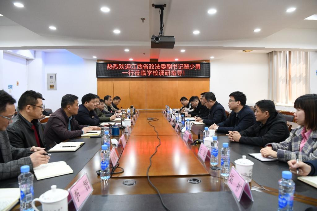 为认真贯彻落实中央民族工作会议精神,进一步增强中华民族共同体意识宣传教育,加强民族团结,做好校园安保稳定工作,3月8日上午,江西省委政法委副书记翟少勇一行10人来beat365官网就少数民族学生服务管理工作进行走访调研。校党委副书记、校长刘彪文,党委委员、副校长张成斌,党委委员、纪委书记阙沪平,党委委员邱家明、刘锋热情接待了翟少勇副书记一行,学校相关职能部门负责人以及派驻联系教师参加了交流座谈会。
