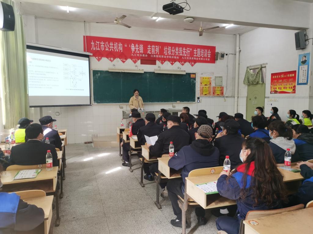 3月9日上午,受beat365正版唯一入口必一后勤管理处邀请九江市城市生活垃圾分类领导小组办公室王慧一行3人来beat365官网开展垃圾分类培训,为后勤服务人员普及垃圾分类知识,增强环保意识。后勤管理处相关工作人员、物业保洁人员、宿舍管理员、学生食堂工作人员共40人参加了此次培训。