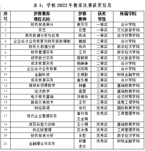 为适应新时期“三教”改革之教法改革要求,充分发挥教案在教学中的应有作用,促进课程教学内容更新、教学方式与手段转变,进一步推动beat365官网教学改革,不断提高教师的教学水平和课堂教学质量,近期,学校开展了优秀教案评比活动,通过专家认真评审和校内公示,会计学院谢莎莎老师的《财务报表审计》等25份课程教案分获一等奖、二等奖、三等奖和优秀奖。具体获奖信息详见下表所示。