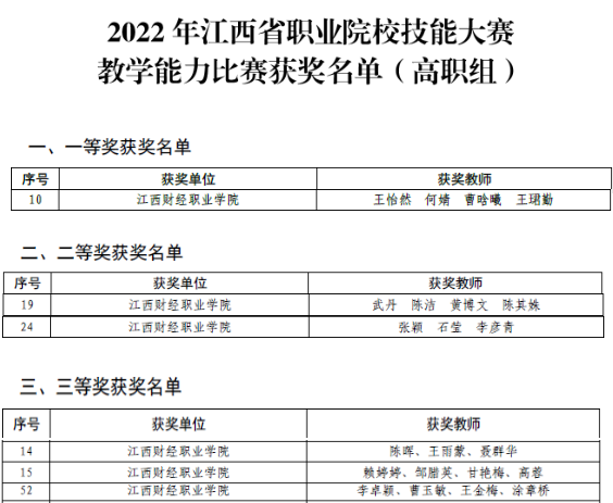 近日,江西省教育厅发文公布了2022年江西省职业院校技能大赛教学能力比赛获奖名单。beat365官网共选送参赛作品8件,荣获一等奖1项、二等奖2项、三等奖3项。