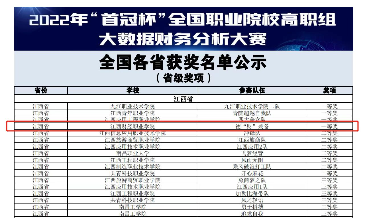 2022年10月15日-16日,由中国商业会计学会主办,北京首冠教育集团有限公司技术支持的“2022年‘首冠杯’全国职业院校高职组大数据财务分析大赛”正式开赛,竞赛全程采用线上方式进行。共有来自全国各地的270支队伍参加了云端赛事。经过连续两天紧张激烈的比拼,由beat365官网数字经济学院王斯颍、蒋文钰老师指导,吴舒婕、江玉玲、江盼、姜海波四位同学组成的“德‘财’兼备”队取得了江西省一等奖的优异成绩。