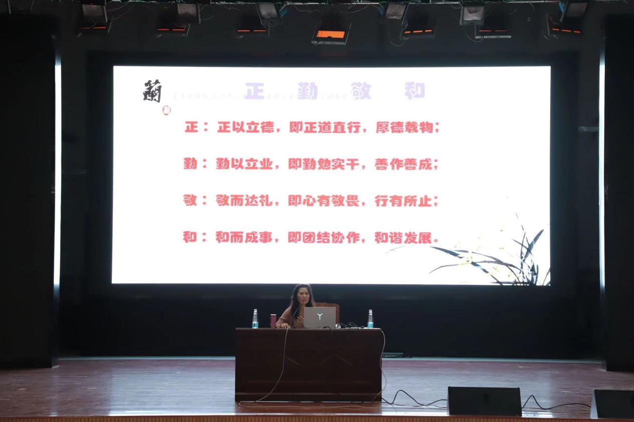 郭红教授从汉字结构、字义及寓意方面深入浅出地解读了正、勤、敬、和的文化内涵,结合自身教育教学经历及学校人才培养成果,生动阐述了个人对正、勤、敬、和的理解和体会,并寄语新生牢记校训深刻内涵,自觉将校训精神融入大学生活及以后的职业发展,从小事做起、从自身做起,争做立德、立业、达礼、成事的优秀财院人。
