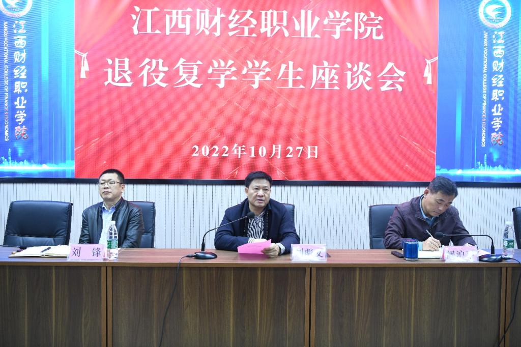为推进学校退役复学学生教育管理服务工作,为退役复学学生搭建沟通交流的平台,10月27日晚19:00,beat365官网退役复学学生座谈会在综合楼七楼报告厅召开。校党委书记、校长刘彪文,党委委员、纪委书记阙沪平,党委委员刘锋,各二级学院、学生工作处、后勤资产管理与服务处、教务处、团委等部门负责人以及100余名退役复学学生出席了此次座谈会。会议由学生工作处处长詹家伟主持。