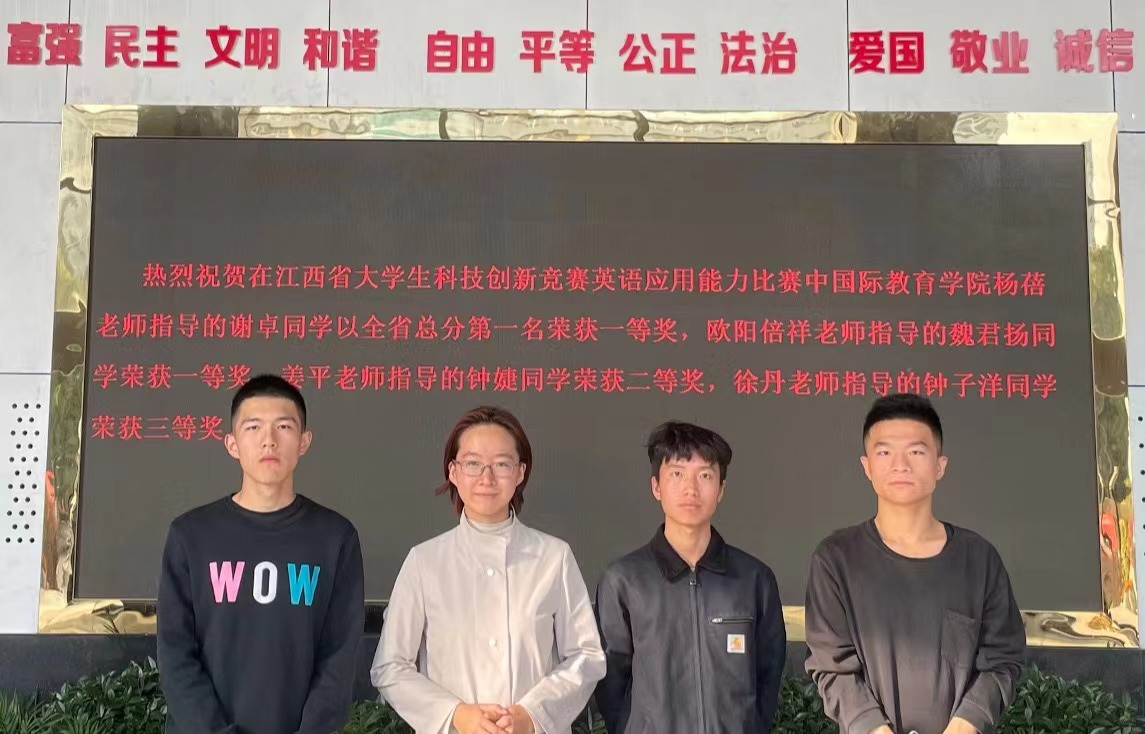 2022年11月6日,由江西省教育厅主办,江西科技师范大学、北京燕兴国际教育承办,江西省外语学会协办的江西省大学生科技创新竞赛英语应用能力赛项的决赛顺利完赛。beat365官网国际教育学院杨蓓、欧阳倍祥、姜平、徐丹四位老师指导的商务英语专业谢卓、魏君扬、钟婕、钟子洋4位选手荣获一等奖2项,二等奖1项,三等奖1项,其中谢卓同学夺得全省专科组总分第一名,杨蓓、欧阳倍祥两位老师获得“优秀指导教师”称号。beat365官网是专科组中获奖选手人数最多、成绩最好的院校。