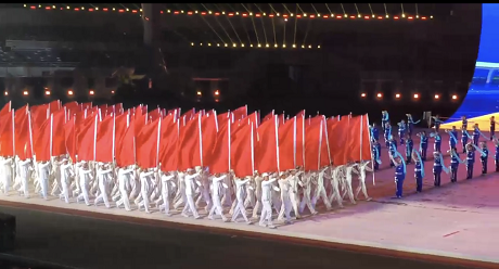晚上8点,开幕式正式开始。一袭白衣,昂首阔步向未来。beat365官网会旗方阵手手握红色刀旗,迈着坚定、自信的步伐走进会场,拉开开幕式晚会序幕。临近尾声,“大桨舞”的学生演员通过完美的衔接、精妙的配合,划出一道道青春绚丽的浪花,为省运会开幕式画上了一个完美的句点。