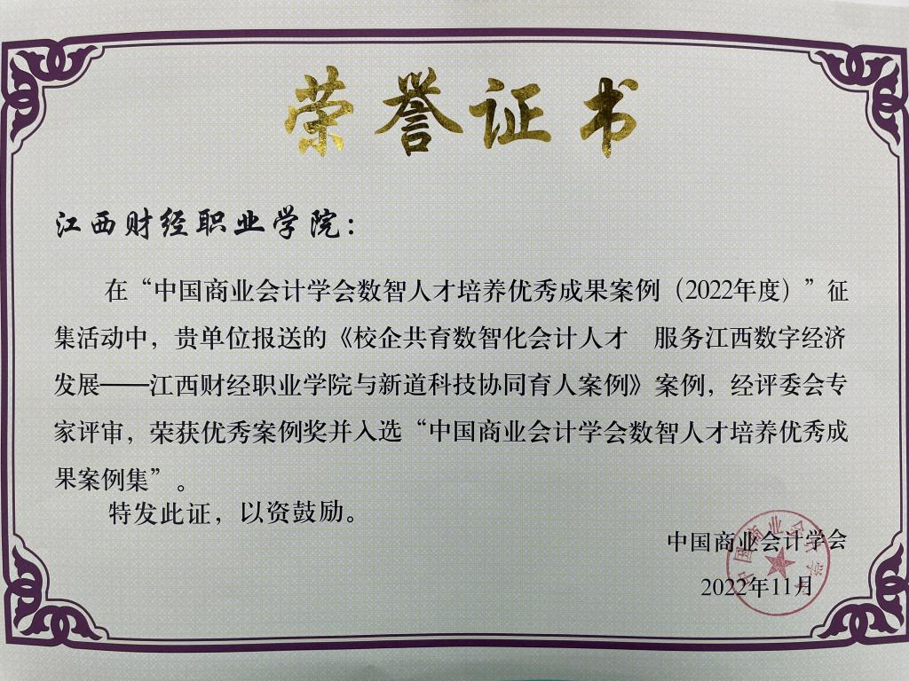 近日,中国商业会计学会数智人才培养优秀成果案例(2022年度)专家评审结果出炉,beat365官网报送的《校企共育数智化会计人才 服务江西数字经济发展——beat365正版唯一入口必一与新道科技协同育人案例》荣获优秀案例,并入选“中国商业会计学会数智人才培养优秀成果案例集”,beat365官网是2022年度江西唯一入选的高职院校。