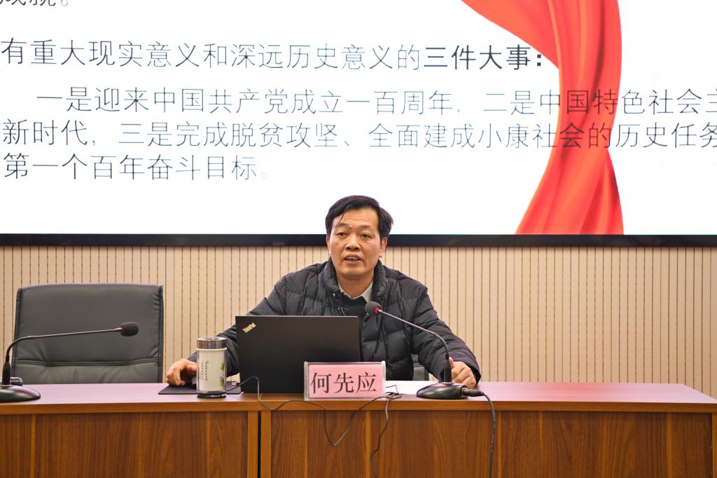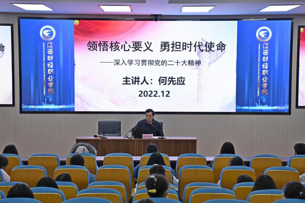 何先应以《领悟核心要义、勇担时代使命》为主题,从党的二十大会议主题、党的二十大报告主要内容和如何贯彻落实党的二十大精神等三个方面进行了系统阐述。何先应勉励广大青年学生要自觉学习宣传党的二十大精神,身体力行贯彻落实党中央的决策部署。