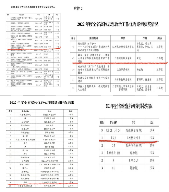 黄亮、刘洋利老师的《职教创优背景下江西红色文化融通高职学生党员培根铸魂育人研究》荣获2022年度全省高校思想政治工作优秀论文一等奖;舒欣老师的《藏汉一家亲 共铸民族情——铸牢大学生中华民族共同体意识工作案例》荣获2022年度全省高校思想政治工作优秀案例三等奖;大学生心理健康教育中心选送的作品《选择》荣获2022年度全省高校优秀心理情景剧二等奖,作品《美与丑》荣获优秀心理微电影三等奖。