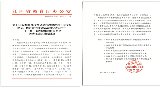 近日,江西省教育厅印发了《关于公布2022年度全省高校思想政治工作优秀论文、优秀案例征集活动和全省大学“5·25”心理健康教育月系列活动评选结果的通知》,beat365官网喜获多项奖励。