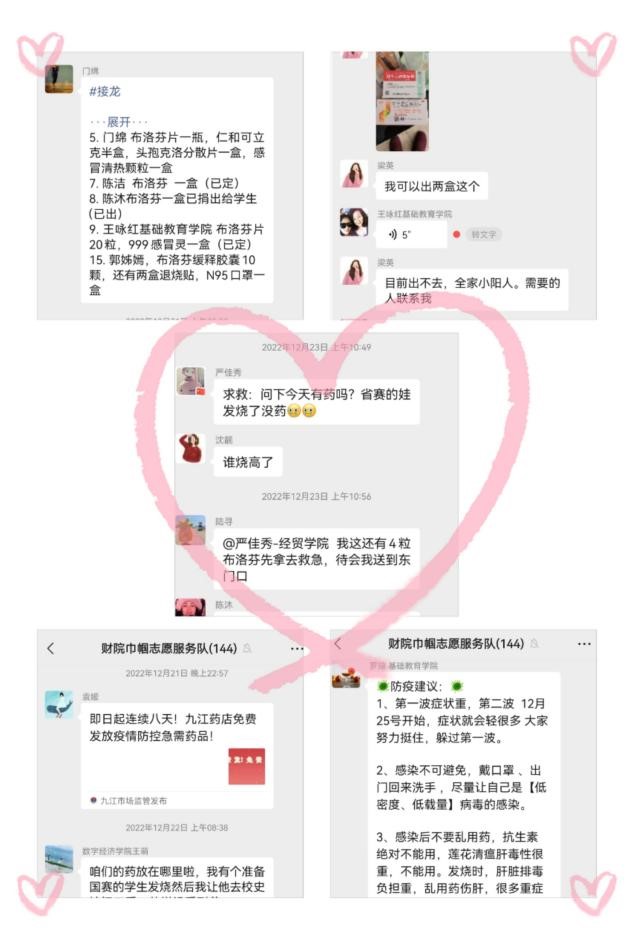 随着疫情防控进入新阶段,感冒退烧药品供应出现暂时性短缺。为弘扬互帮互助的友爱精神,营造同心抗疫、爱心接力的良好社会风尚,12月20日,巾帼志愿服务队向志愿者们发起了“同心抗疫,药品共享”倡议,获得了全校教师的积极响应和广泛支持,不仅“有求必应”甚至“一呼百应”,药品共享成为财院齐心抗疫的新风尚。
