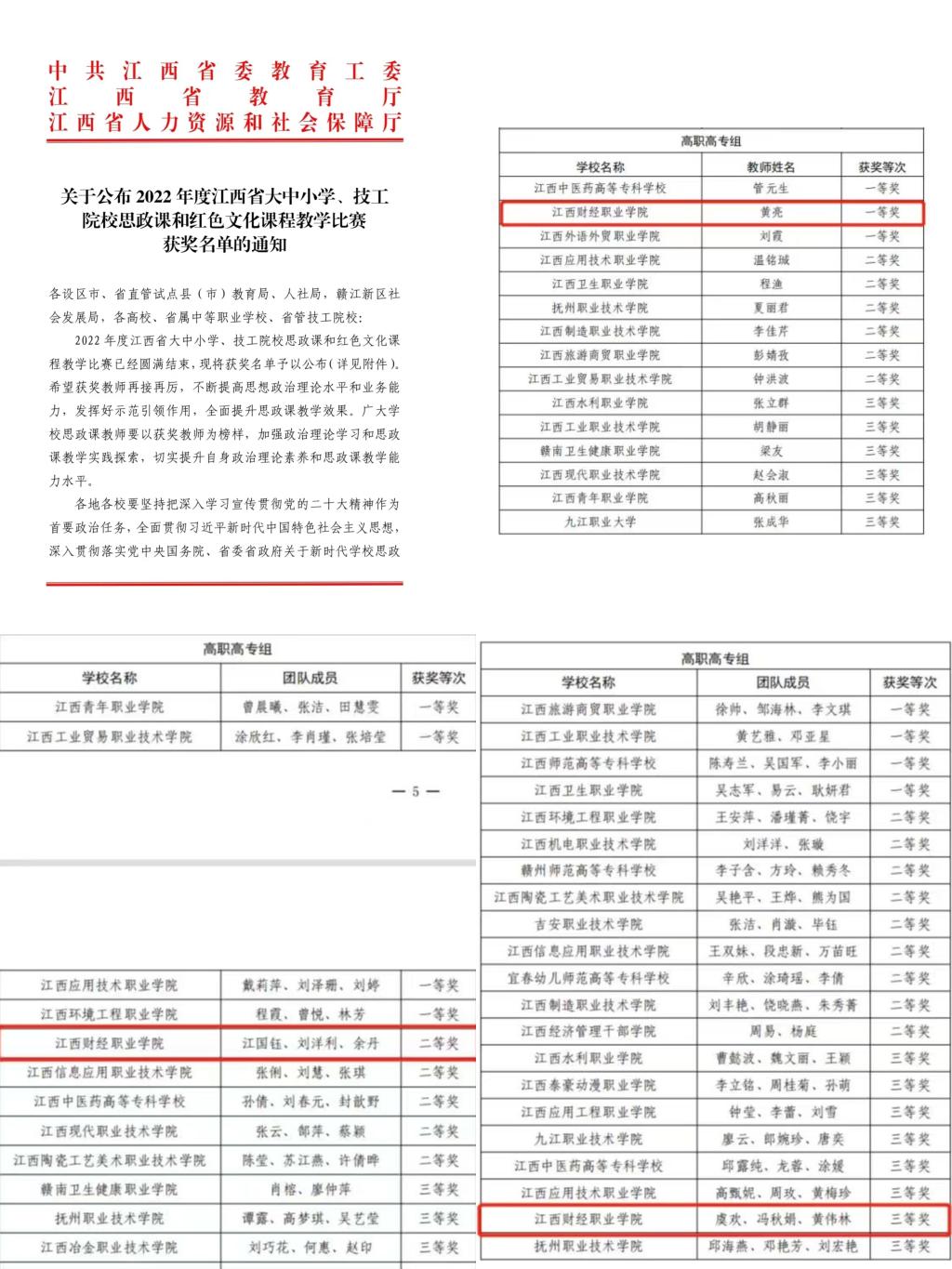 近日,中共江西省委教育工委、江西省教育厅、江西省人力资源和社会保障厅公布了2022年度江西省大中小学、技工院校思政课和红色文化课程教学比赛获奖名单,beat365官网教师再获佳绩,黄亮老师获《红色文化十讲》一等奖,江国钰、刘洋利、余丹团队获“毛泽东思想和中国特色社会主义理论体系概论”课二等奖,虞欢、冯秋娟、黄伟林团队获“思想道德与法治”课三等奖。