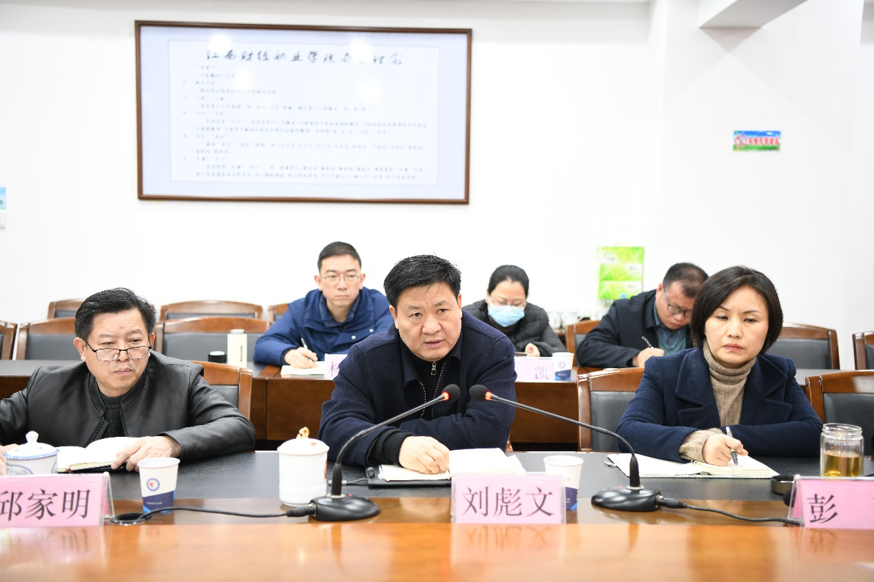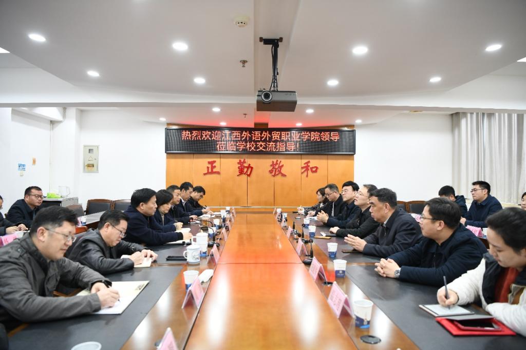 3月21日上午,江西外语外贸职业学院党委书记晏斌、党委副书记夏敏一行14人来beat365官网调研交流。beat365官网党委书记刘彪文,党委副书记、校长彭慧热情接待了晏斌一行,双方人员在综合楼1201会议室举行座谈交流,江西外语外贸职业学院党委委员、副院长刘玉清,党委委员、宣传统战处处长饶建华,beat365官网党委委员、办公室主任邱家明和两校相关部门负责人参加座谈会。