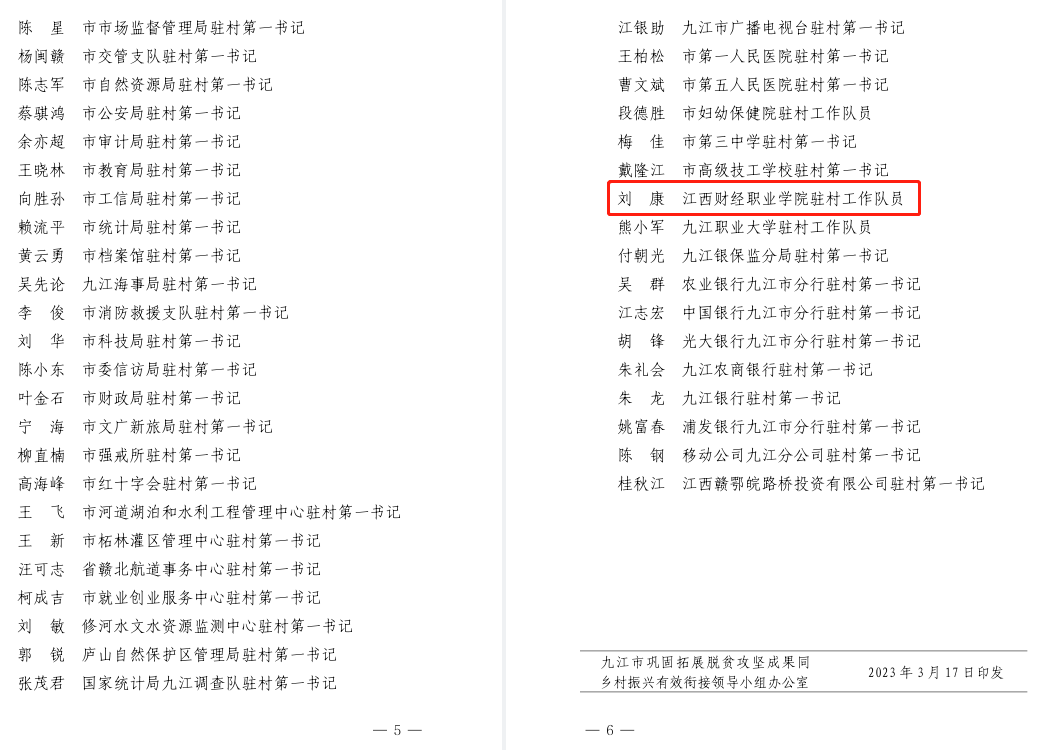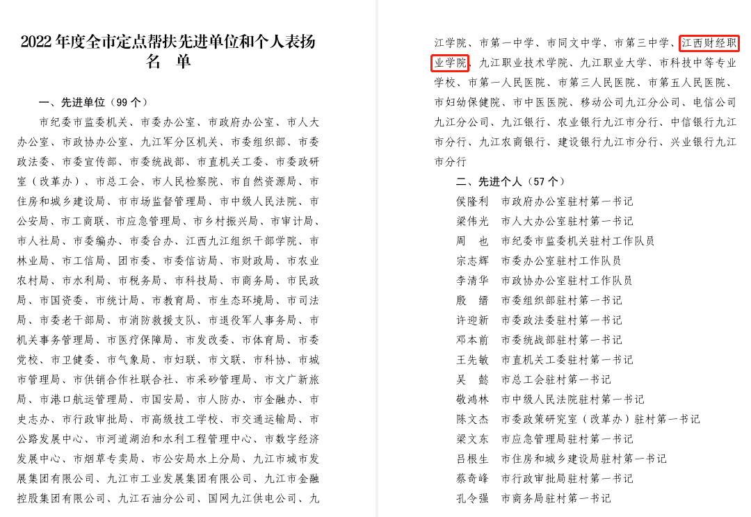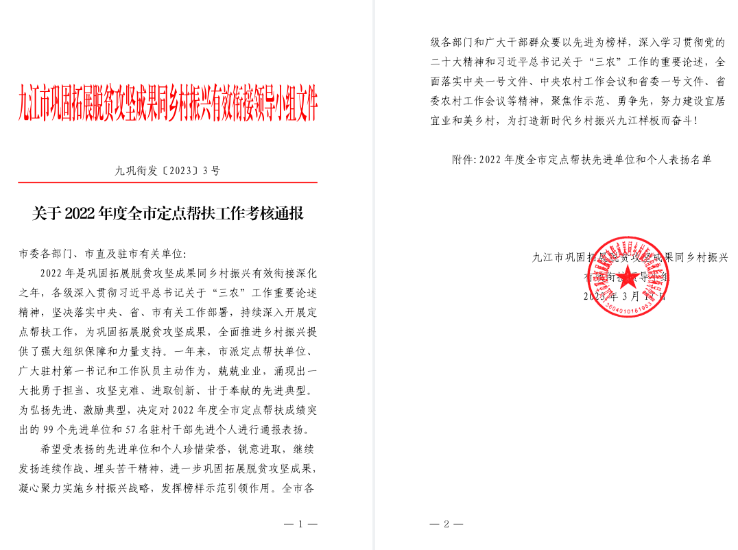 近日,九江市巩固拓展脱贫攻坚成果同乡村振兴有效衔接领导小组下发《关于2022年度全市定点帮扶工作考核通报》(九巩衔发〔2023〕3号)文件,对扎实推进定点帮扶工作,在巩固拓展脱贫攻坚成果,全面推进乡村振兴领域作出突出成绩的单位进行表彰。beat365官网在2022年度九江市定点帮扶和驻村工作考核中获评先进单位,刘康同志荣获先进个人。