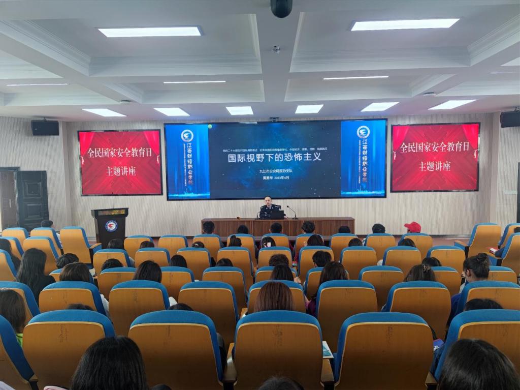 活动一:专题讲座。学校联合九江市公安局开展国家安全教育宣传日主题讲座,内容涉及《国家安全法》《反恐怖主义法》《反间谍法》等法律法规和生活中涉及国家安全的公民权利与义务的常识,引导师生增强安全意识和法治观念,自觉守法护法。