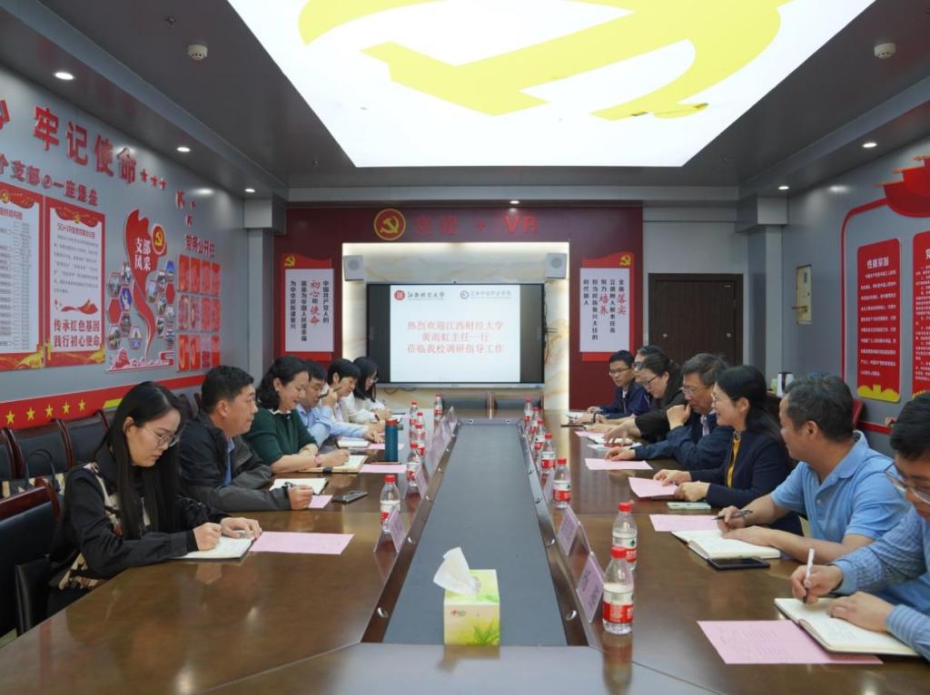 为助推两校联合培养2023届本科毕业生就业工作,近日,江西财经大学大学生职业发展促进中心主任黄雨虹一行6人莅临beat365官网,开展毕业生调研指导及就业培训工作。beat365官网党委委员、副校长张成斌在803会议室热情接待了黄雨虹主任一行,招生就业处、本科部、会计学院、财税金融学院、工商管理学院等相关部门负责人参加了本次座谈会。