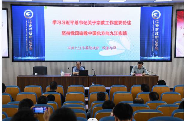 为深入学习领会习近平总书记关于维护意识形态安全和做好宗教工作的重要论述,宣传贯彻党的宗教政策,进一步增强beat365官网干部教师开展宗教工作能力,5月26日下午,特邀请中共九江市委统战部副部长、二级巡视员欧阳存凤来校作专题讲座,校党委副书记、常务副校长何先应主持此次讲座,各二级学院党总支书记、副书记,相关部门负责人,全体班主任,辅导员,统战工作人员等到场聆听讲座。