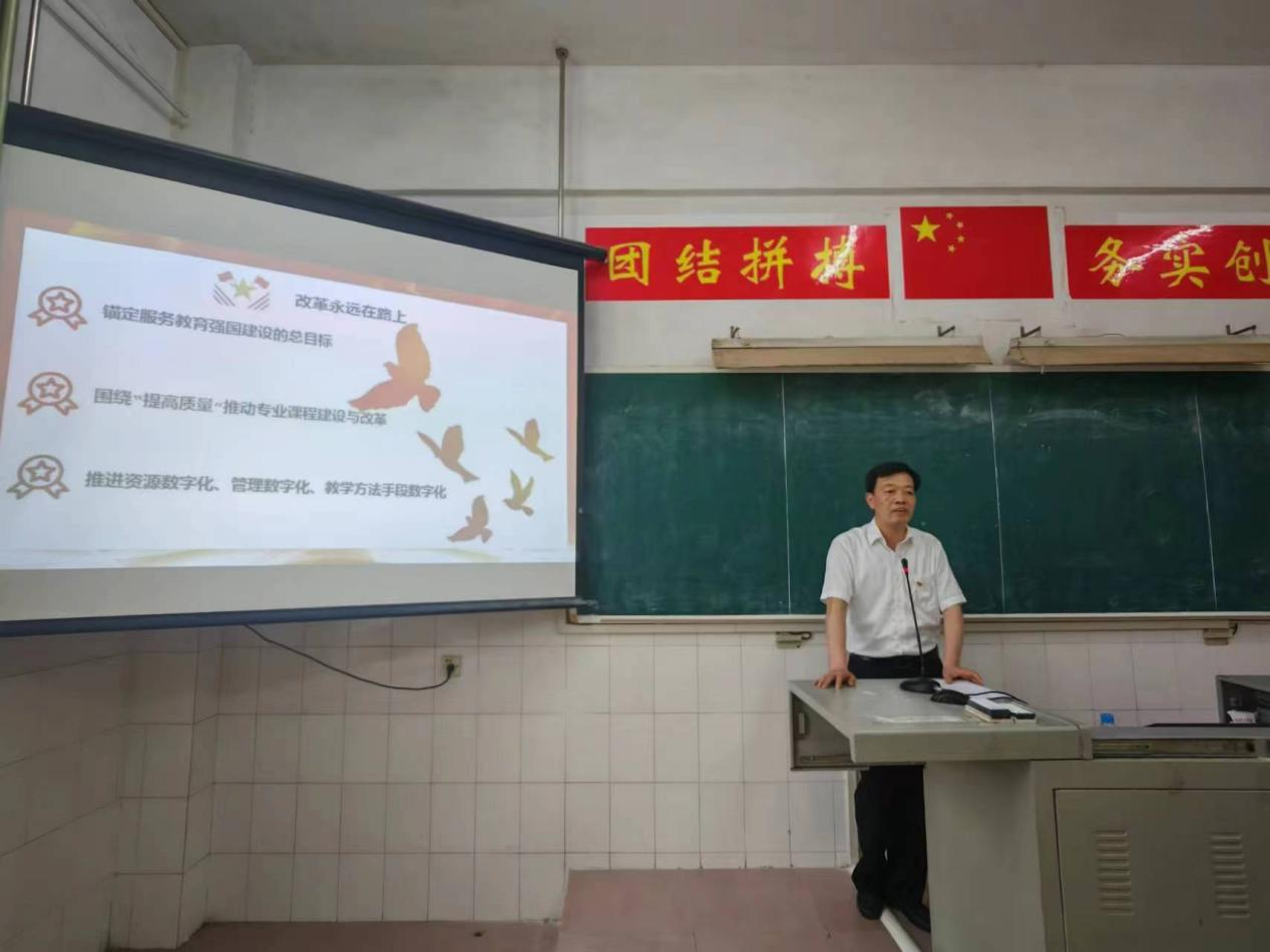 何先应强调,广大党员、教师要坚持读原著、学原文、悟原理,提高理论素养、强化理论武装,把学习成果转化为奋进新征程,建功新时代的强大动力。要贯彻落实习近平总书记对职业教育“前途广阔、大有可为”的重要指示精神,认真学习职业教育相关政策文件精神,把握职业教育改革发展方向。教师的素质决定着教育的质量,教育的质量决定着培养人才的规格,广大党员、教师要加强自我修养和实践锻炼,争做“有理想信念、有道德情操、有扎实学识、有仁爱之心”的“四有”好老师。职业教育是教育综合改革的突破口和最大增量,广大党员、教师要锚定服务教育强国建设的总目标,围绕“提高质量”推动专业课程建设与改革,推进资源数字化、管理数字化、教学方法手段数字化等教育数字化建设。