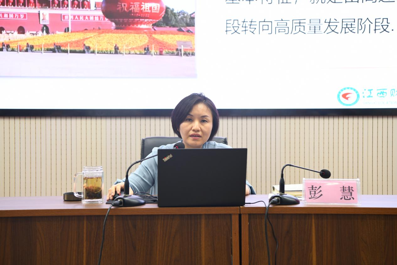 彭慧围绕“奋楫争先,努力开创高质量发展新局面”这一主题,从“为什么高质量发展是首要任务”“什么是高质量发展”“如何推动高质量发展”等三个部分展开,结合党的二十大决策部署和学习贯彻习近平新时代中国特色社会主义思想主题教育,当前国内外形势,地方经济社会发展和学校“十四五”规划等情况,用生动的语言、典型的案例从历史、实践、理论等视角系统阐述高质量发展。