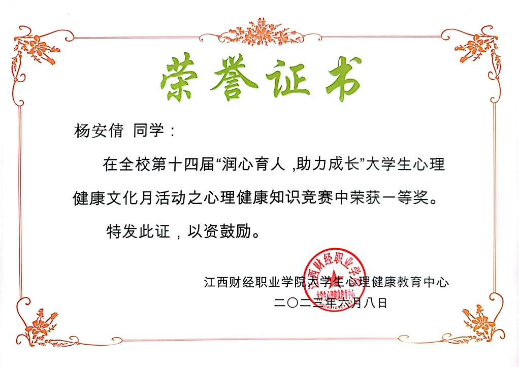 6月8日,大学生心理健康教育中心进行了表彰工作,22级心理咨询2班杨安倩荣获一等奖,22级会计信息管理2班李明盛、22级会计信息管理3班肖芸天、22级市场营销uc3班黄小芬获得二等奖,22级大数据与会计(数字化运营管理)1班熊昌蕾、市场营销uc2班绉沛茹等同学获得三等奖。
