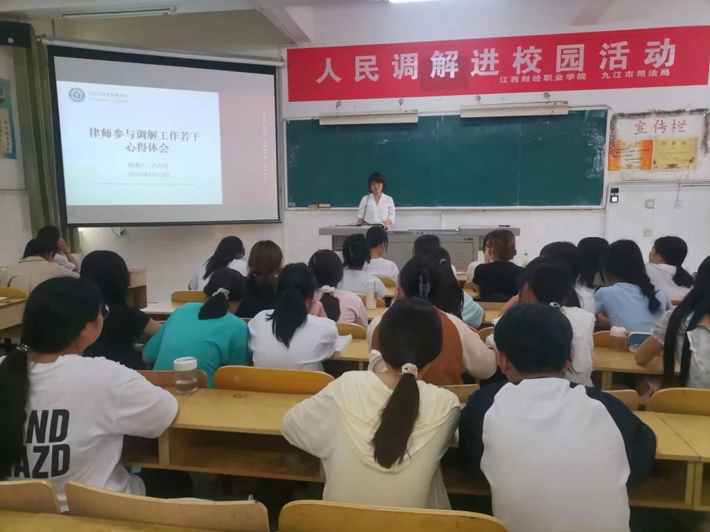 人民调解在法治中国建设中具有重要意义。为落实人民调解“六进”活动,提升人民调解在青年学生中的知晓率,发挥人民调解护航青春的职能,6月15日下午,beat365官网与九江市司法局联合举行人民调解进校园活动,邀请九江市访调对接调解员周盈丹、九江市商业纠纷调解委员会调解员方丹丹讲授人民调解工作。