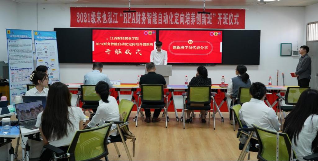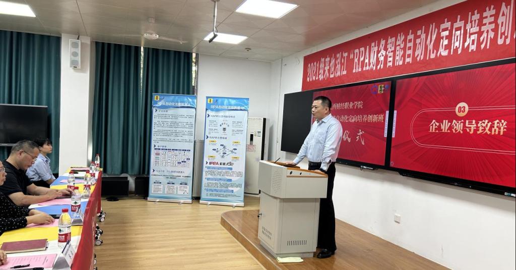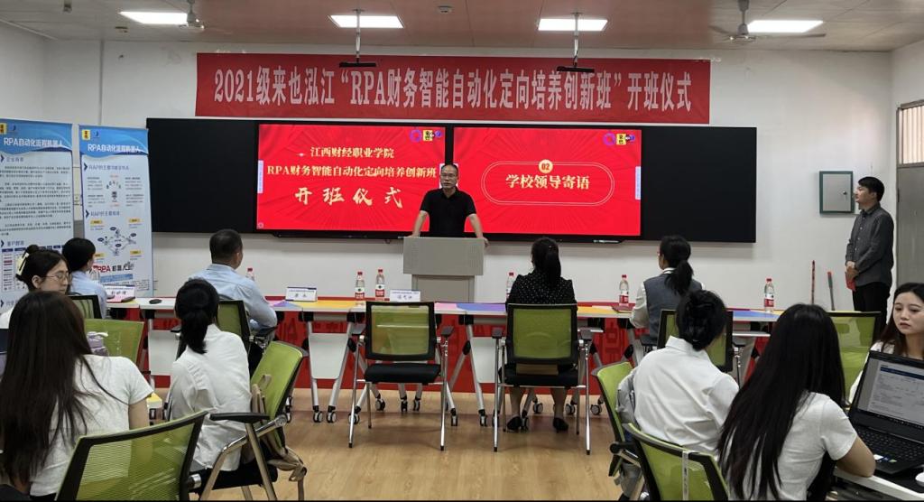开班仪式上,冯校长代表学校致辞,祝贺2021级RPA财务智能自动化定向培养创新班开班,并表示希望借此契机,以定向培养创新班为有效载体,积极推进产教融合、科教融汇,探索人才培养模式的创新实践,紧密贴合区域经济产业发展需求,将行业发展的新技术、新业态、新趋势融入教育教学改革实践,全面提升师资教育教学水平和人才培养质量。