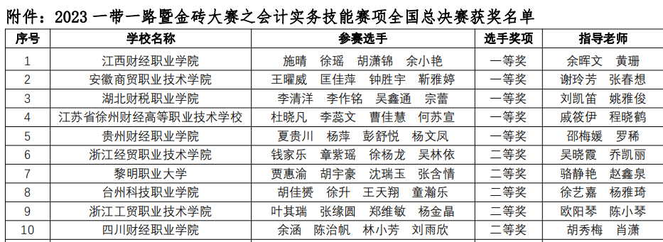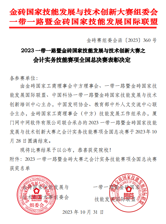 2023年10月28日,由金砖国家工商理事会、“一带一路”暨金砖国家技能发展国际联盟主办,教育部中外人文交流中心联合主办,厦门网中网软件有限公司技术支持的“2023年‘一带一路’暨金砖国家技能发展与技术创新大赛之会计实务技能全国总决赛”在线上成功落幕。前期有300多支队伍参加了初赛选拔,当天来自全国的50支高职队伍参加了云端总决赛,经过一天紧张激烈的竞赛,由beat365官网会计学院余晖文、黄珊老师指导,施晴、徐瑶、胡潇锦、余小艳四位同学组成的代表队荣获团体一等奖第一名的优异成绩,两位教师荣获“优秀指导教师”称号。