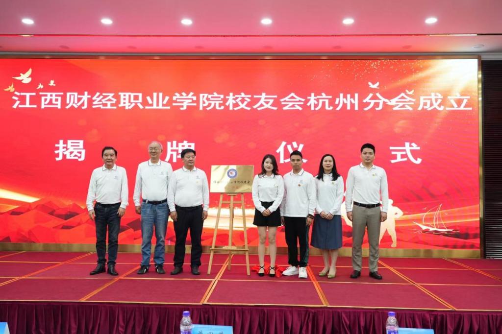 刘彪文、谢小云、魏发平和杭州分会会长单国英,执行会长龚诗平,轮值会长刘勇期、谢秋香共同为校友会杭州分会揭牌。