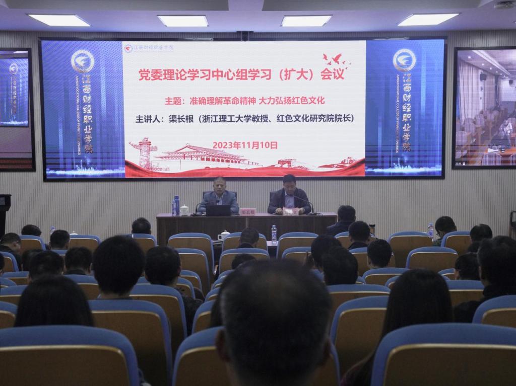 11月10日上午,学校在七楼报告厅召开党委中心组学习(扩大)会,特别邀请浙江理工大学红色文化研究院院长渠长根教授作题为《准确理解革命精神 大力弘扬红色文化》的辅导报告。校党委书记刘彪文主持会议,校领导班子成员出席,中层干部、全体辅导员参加学习,南昌校区同步视频参会。
