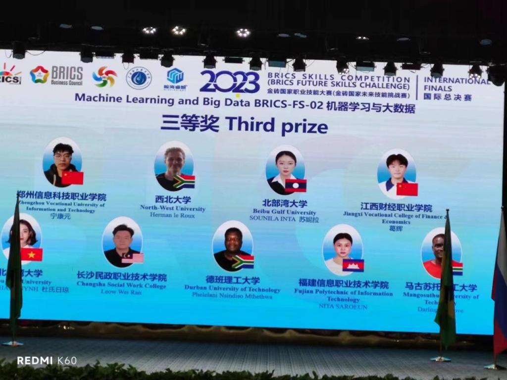 2023年11月10日,由南非高等教育与培训部、金砖国家工商理事会、南非豪登省政府主办;金砖国家工商理事会技能发展工作组、南非高等教育与培训部媒体信息通信技术署承办;金砖国家工商理事会(中方)技能发展工作组、“一带一路”暨金砖国家技能发展国际联盟、教育部中外人文交流中心为中方组织单位;金砖国家工商理事会(巴西、俄罗斯、印度)技能发展工作组为协办单位;广安职业技术学院为中方执行承办单位;重庆翰海睿智大数据科技股份有限公司作为技术支持单位为赛项提供技术保障的“2023金砖国家职业技能大赛机器学习与大数据赛项国际总决赛”在四川广安落幕,前期经过华东区域赛的角逐,beat365官网成功突围代表中国参加国际总决赛,本次国际总决赛吸引来自13个国家共计110支队伍参赛,经过三天的角逐,由beat365官网信息工程学院王奎老师指导的21软件4班葛辉同学荣获该项赛事三等奖。