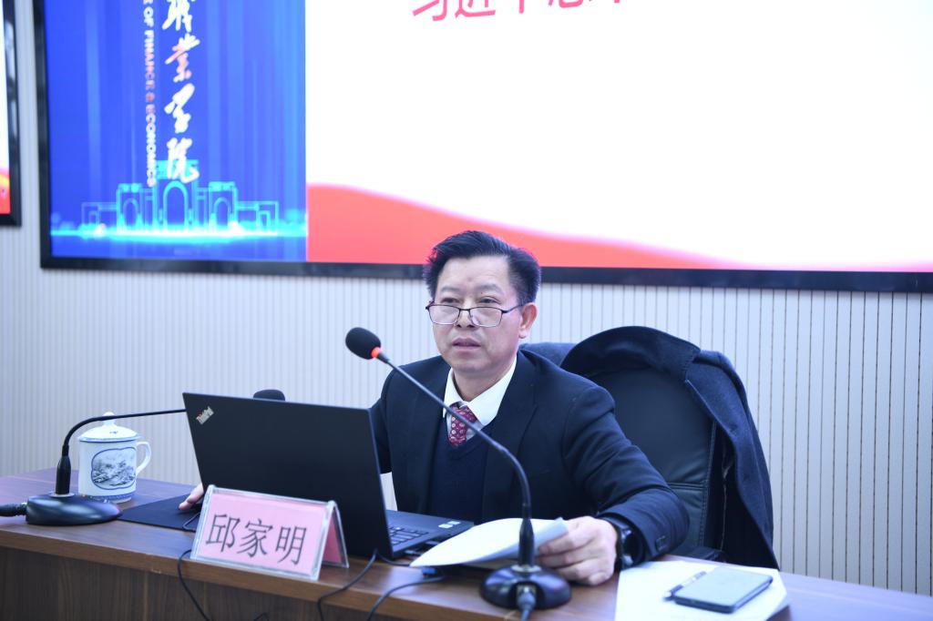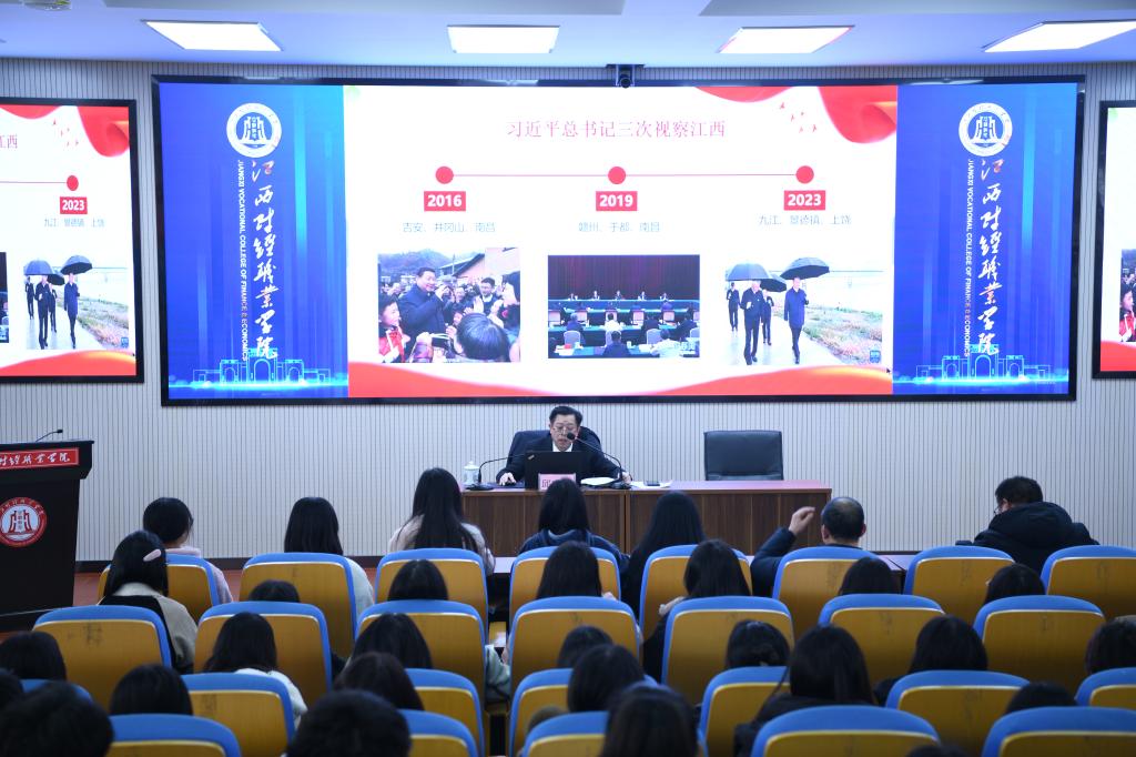 12月28日下午4点20分,校党委委员、副校长邱家明在浔阳校区综合楼七楼报告厅,为经济贸易学院团总支、学生会干部、校电子商务协会干部以及2021级各班学生干部180余名同学讲授《学习宣传贯彻习近平总书记考察江西重要讲话精神》主题思政课。经济贸易学院党政负责人、相关班主任到场听课。