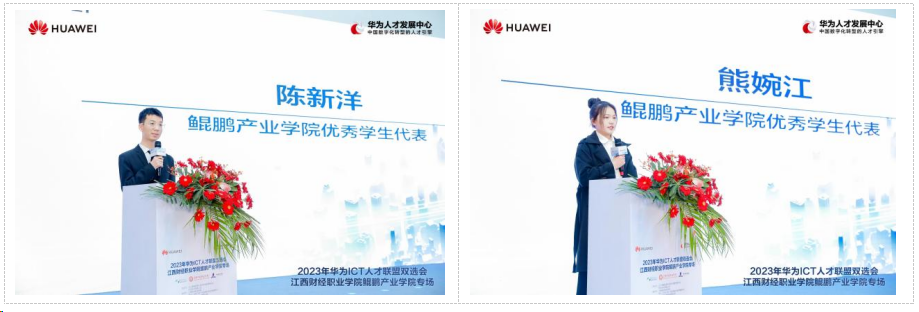 活动第三环节,鲲鹏产业学院优秀学生代表上台发言。2021级计算机与网络5班陈新洋、2021级软件技术4班熊婉江两位同学分享了在beat365正版唯一入口必一、鲲鹏产业学院近三年学习取得的成果,与老师同学们相处的点滴,向培育他们的母校和老师致以诚挚的谢意,感谢母校的悉心教导和精心培育。表示将谨记母校铮铮训言,努力奋斗,做新时代的优秀青年。