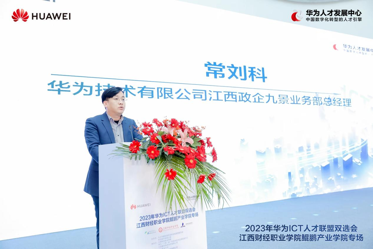 华为技术有限公司江西政企九景业务部总经理常刘科在讲话中谈到,今天邀请的华为生态链企业在此举办“华为ICT人才联盟双选会”,向同学们推送实习和就业岗位,希望大家抓住机会,和心仪的企业多多互动。希望各位同学把在鲲鹏产业学院所学到的知识应用到工作中,为行业的数字化转型做出贡献,创造更大价值!未来将加强与高校深化校企合作,培养更多新时代所需的高素质ICT人才,为中国科技自立自强和数字经济发展贡献力量。