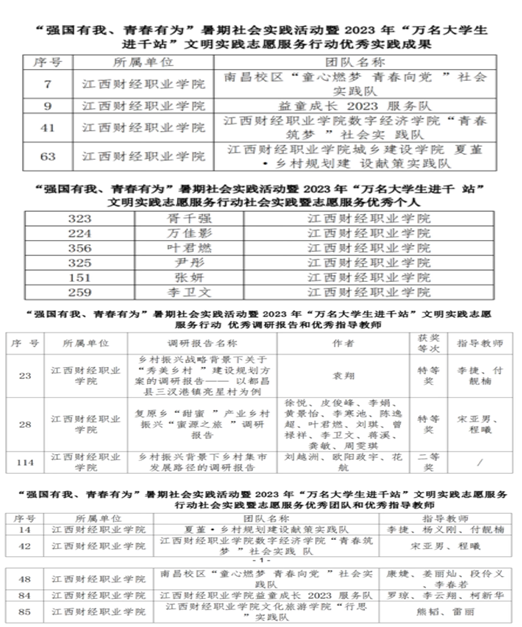 数字经济学院“青春筑梦”社会实践队等4支团队成果获评“优秀实践成果”,夏堇•乡村规划建设献策实践队等5支团队荣获“优秀团队”荣誉称号,李捷等14位教师获“优秀指导教师”称号,《乡村振兴战略背景下关于“秀美乡村”建设规划方案的研究报告--以都昌县三汊镇亮星村为例》等3篇调研报告荣获“优秀调研报告”,胥干强等6名同学获评“优秀个人”,展现了beat365官网学子的青春风采。