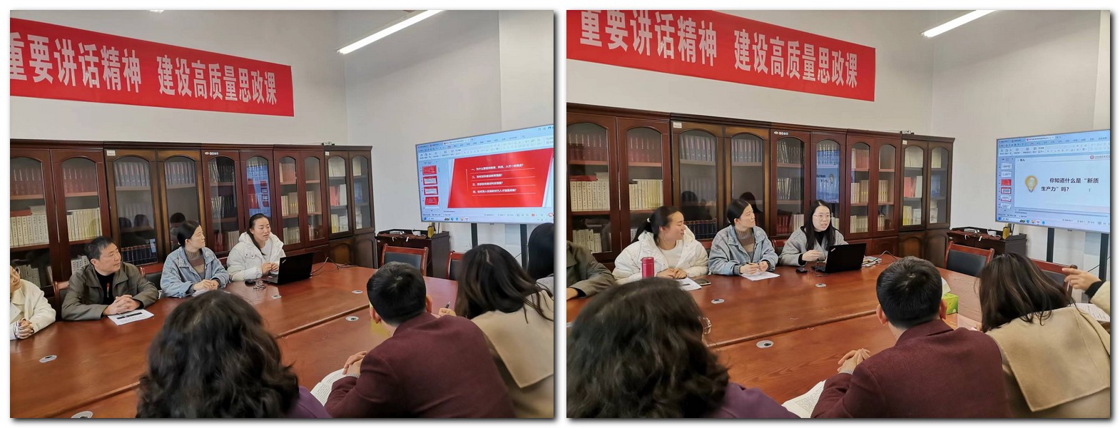 专题展示环节,“习近平新时代中国特色社会主义思想概论”课课程负责人江国钰和优秀青年教师钟水青进行说课。对“如何推动高质量发展”专题,江老师在分析教学目的、学情、教学方法后,着重围绕“如何完整、准确、全面贯彻新发展理念”“如何坚持和完善社会主义基本经济制度”“如何加快构建新发展格局”三个核心问题进行展示,不仅引用了习近平总书记的相关重要论述,更是将刚刚结束的两会精神及时融入其中。在“如何正确理解社会主义现代化建设的教育、科技、人才战略”专题,钟老师的展示在分析教材逻辑结构的基础上逐次展开,结合党的二十大报告系统阐述“为什么要坚持教育、科技、人才一体推进”后,再分别从“怎样加快建设教育强国”“怎样加快建设科技强国”“如何深入实施新时代人才强国战略”三个方面进行阐述。两位老师的展示逻辑清晰、问题环环相扣、重难点突出。