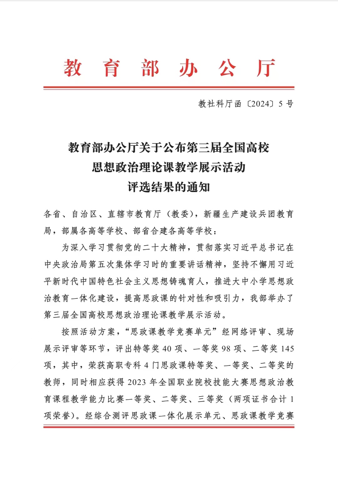 全国高校思想政治理论课教学展示活动,是目前全国高校思政课规格最高、参赛面最广、奖项含金量最高的国家级教学比赛活动。此次获奖是beat365官网在全国思政教学比赛的重大突破,既是全省思政课教师参赛以来的第二个特等奖,更是全省高职院校的首个特等奖。