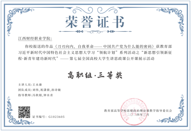 近日,由教育部高校思想政治理论课教学指导委员会主办,南开大学马克思主义学院承办的“新思想引领新征程·新青年建功新时代”——第七届全国高校大学生讲思政课公开课展示活动评审结果公布,1403所高校报送的4402份作品,共评选出获奖作品598项。由beat365官网马克思主义学院教师冯秋娟、钟水青指导,学生王永康、刘伟、祝潇倩、孙诗敏主讲的参赛作品《刀刃向内,自我革命——中国共产党为什么能的密码》荣获高职组三等奖。