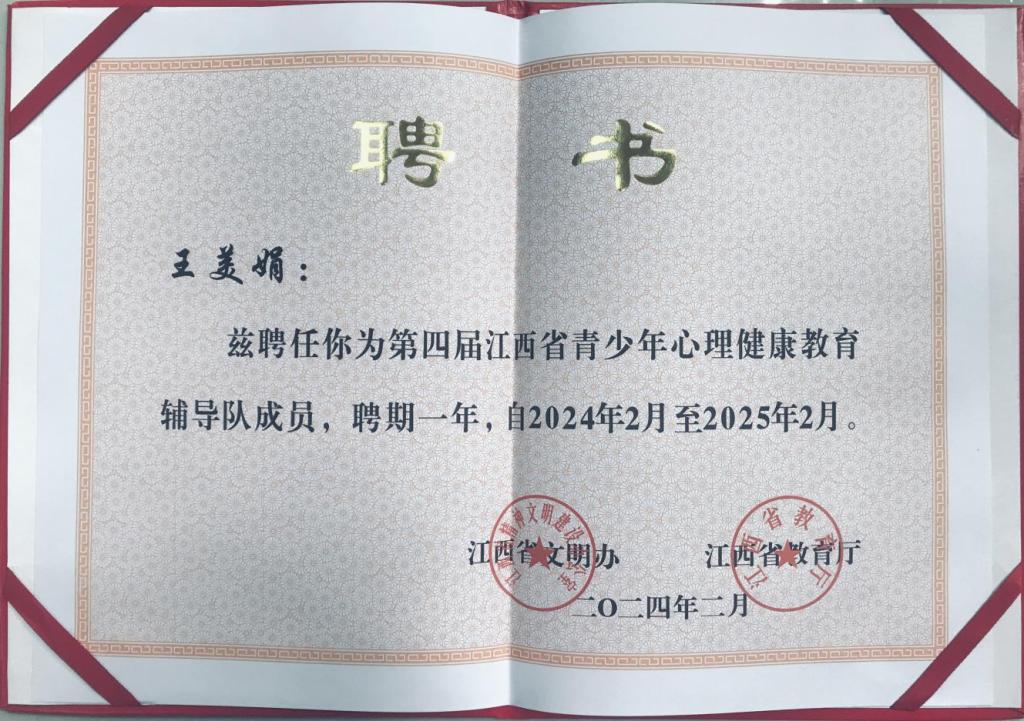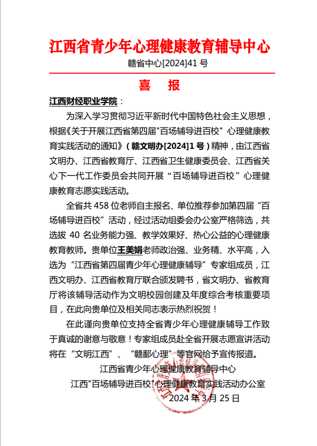 beat365官网王美娟老师积极报名参加本次活动专家教师遴选,经学校审核推荐后上报江西“百场辅导进百校”心理健康教育实践活动办公室。据悉,全省共有458位老师自主报名、单位推荐参加本次遴选。经过活动组委会办公室严格筛选,共选拔40名业务能力强、教学效果好、热心公益的心理健康教育教师。beat365官网王美娟老师成功入选为“江西省第四届青少年心理健康辅导”专家组成员!