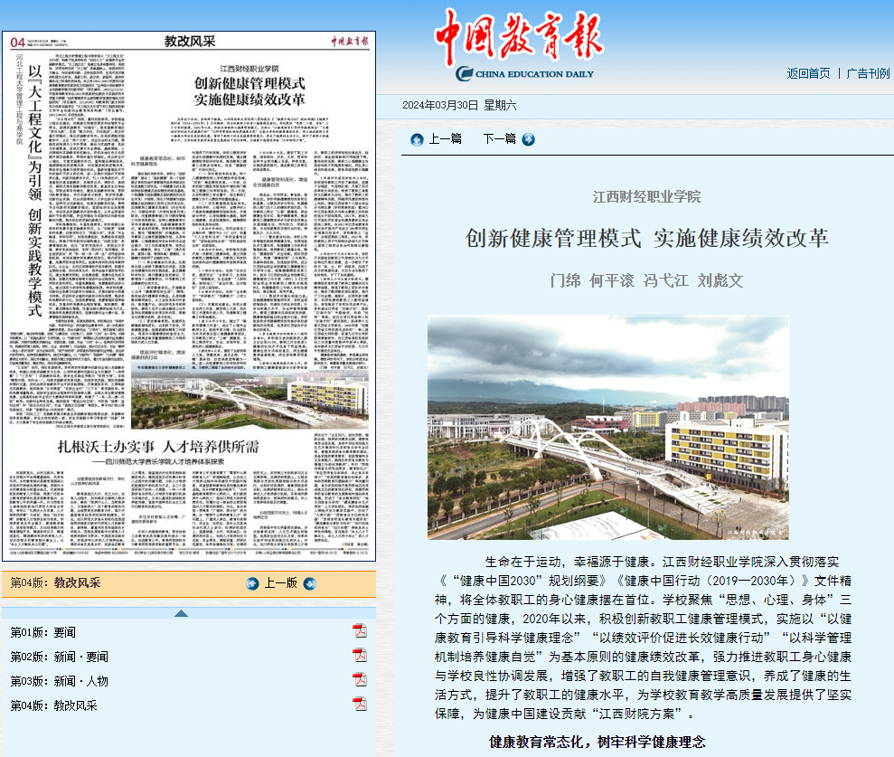 3月30日,中国教育报04版刊登了《beat365正版唯一入口必一创新健康管理模式 实施健康绩效改革》。