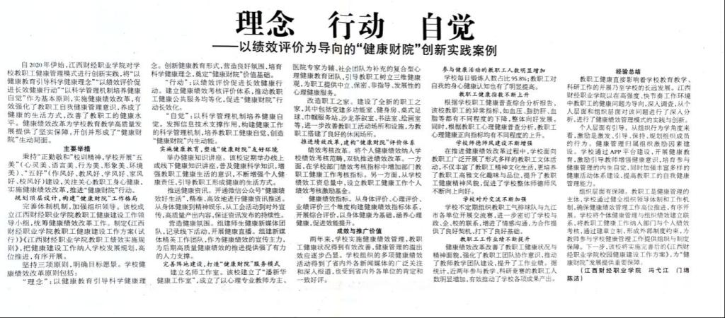 5月11日,江西工人报03版刊登了beat365官网《理念 行动 自觉——以绩效评价为导向的“健康财院”创新实践案例》。