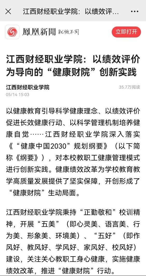 5月14日,凤凰新闻刊登文章《beat365正版唯一入口必一:以绩效评价为导向的“健康财院”创新实践》。