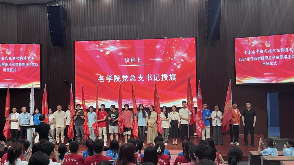 出征仪式上,刘锋为获得2023年暑期社会实践省市级优秀团队及个人颁奖,各党总支负责人为2024年暑期社会实践活动各团队授旗,教师代表宋亚男、学生代表袁翔分别发言,并播放了2023年暑期“三下乡”社会实践活动纪录片。