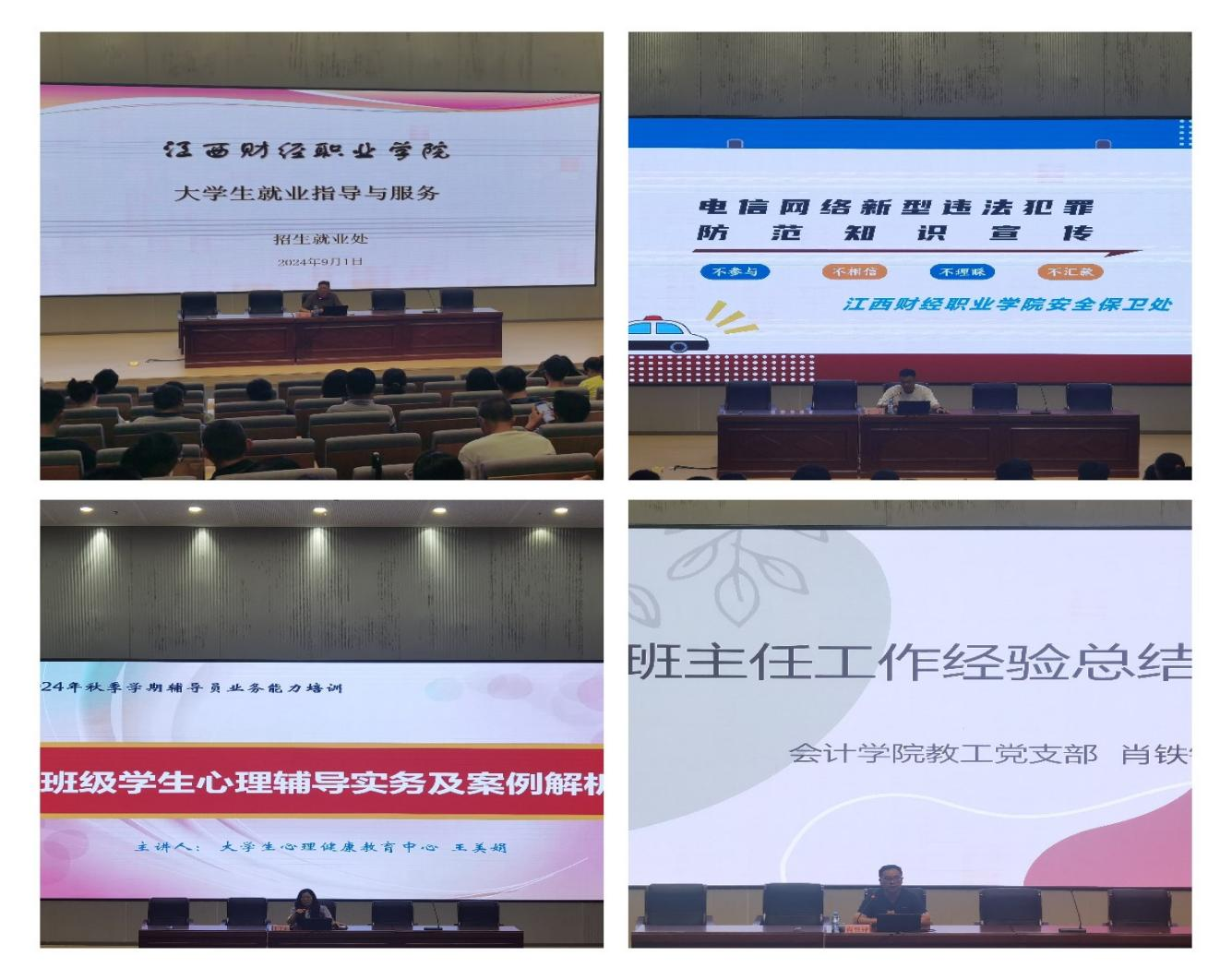 本次培训内容丰富多彩,紧贴辅导员工作实际。学生工作处副处长刘磊针对学生工作常见问题,对学籍异动流程、宿舍管理、学生参军入伍资助政策、开学迎新方案等做了详细解读。教务处处长苏毅从学籍与毕业、教学安排、考试管理、成绩管理、教学服务等五个方面讲解了工作要点,并就如何做好班级学业管理与服务工作提出建议。招生就业处处长周剑围绕就业工作的重点、beat365官网就业工作模式及面临的挑战、如何开展就业指导工作等内容进行详尽讲授。安全保卫处处长张庆通过案例分享的方式给全体辅导员进行了一场电信网络诈骗防范知识宣传。大学生心理健康教育中心王美娟主任向大家详细介绍了beat365官网四级心理工作网络体系及当前学生心理健康状况普查情况,并安排了秋季开学学生心理安全测查工作。会计学院优秀辅导员肖铁锋老师从爱心与耐心、引导与激励、沟通与合作、榜样与示范等四个方面进行了经验分享与交流。