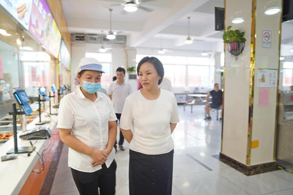 在南区食堂,彭慧一行检查了食堂用餐环境并听取相关负责人关于迎新期间供餐情况的汇报。彭慧强调要做好食堂管理,聚焦师生餐饮需求,把好食品安全“总开关”,不断提升师生获得感、幸福感。