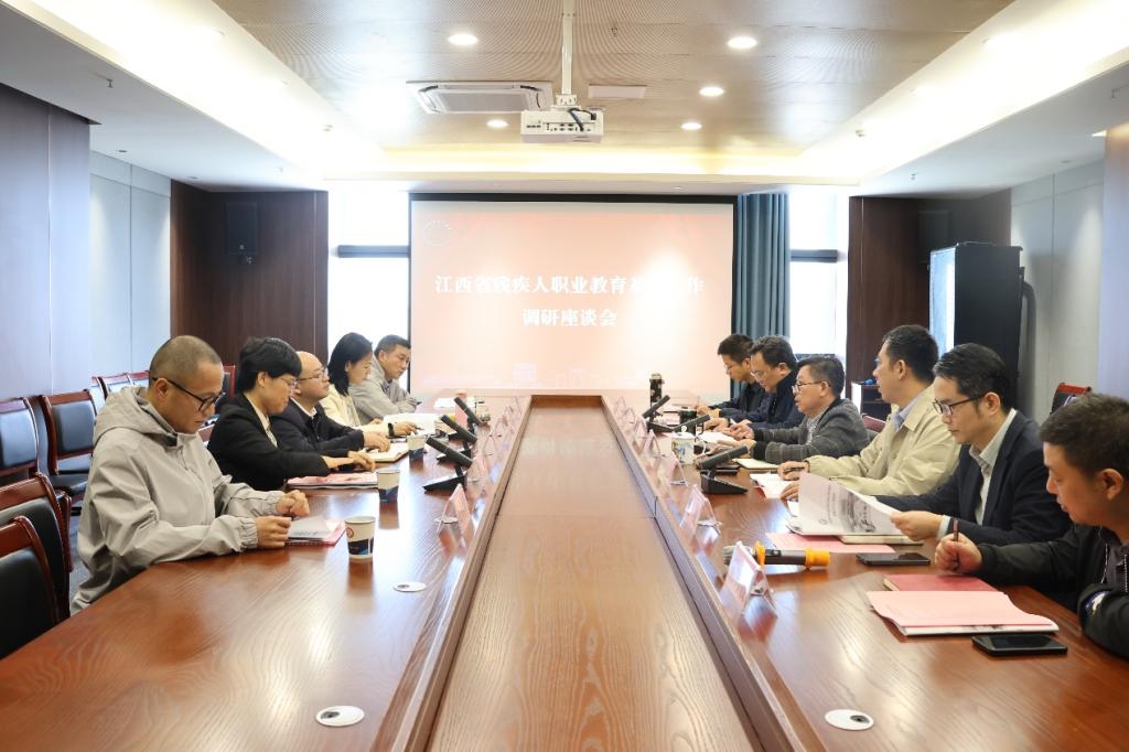 10月25日,省残联教育就业处处长赖建宁、二级调研员秦闽丽来到beat365官网考察调研残疾人职业教育基地建设情况,九江市残联理事长高荃、副理事长陈大友、教就科科长葛有祥、工作人员李丹陪同调研。校党委委员、副校长邱家明以及学校相关部门负责同志参加调研座谈。